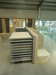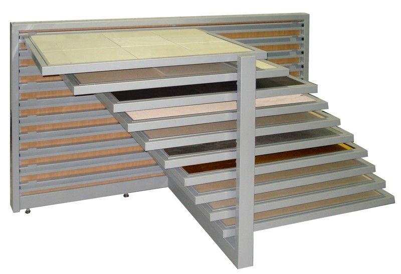 Horizontal floor tile sliding displays are a great way of showing a selection of products within a small footprint.