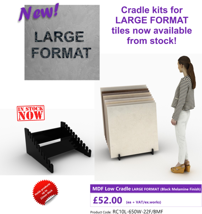 We all know that tiles are just getting bigger and bigger, so in response to customer demand we now manufacture MDF cradle kits designed to hold large format tiles from 750mm up to 1200mm square, and for tiles up to 22mm thick. These are similar to the tried and tested cradles that we've been making for many years - just larger, and available from stock!