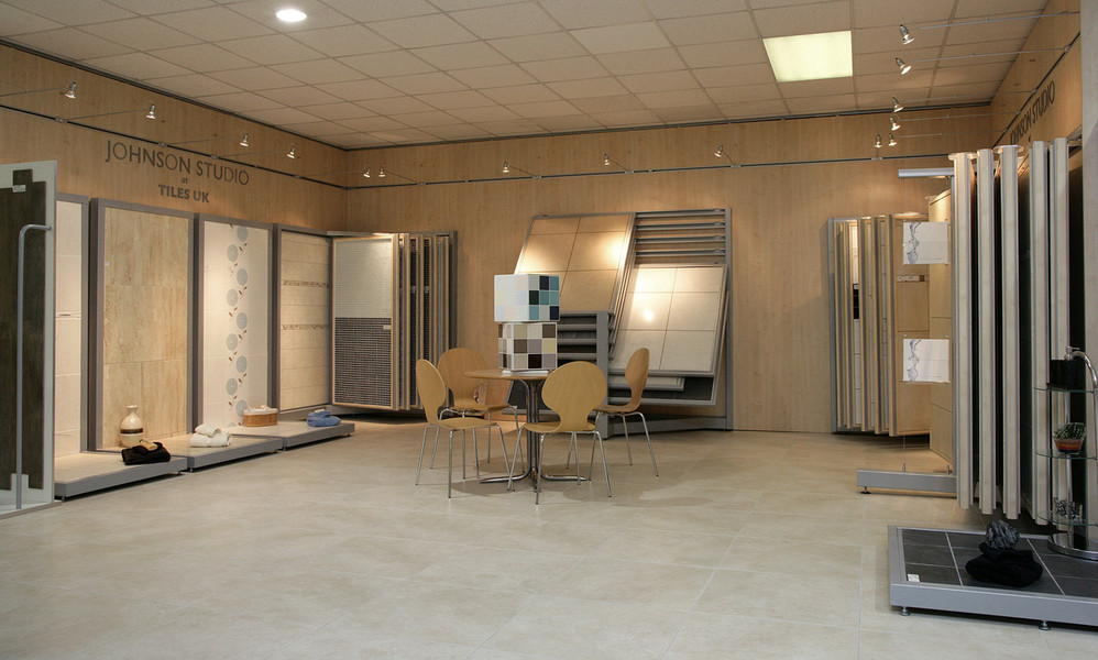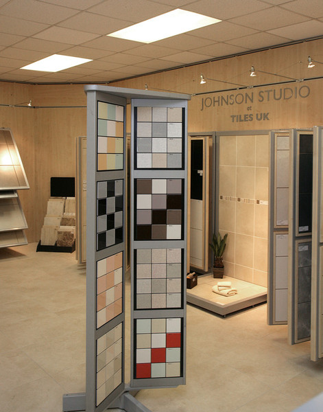 Vision were chosen by H&R Johnson Tiles to carry out the re-vamp of their extensive tile area in the Tiles UK Manchester (Salford) showroom. Vision worked closely with the client to prepare a new design scheme based around the Vision range of silver & maple finish displays. The installation works included the provision of a new maple-clad stud wall system required to accentuate the H&R Johnson area within the showroom and provided spot lighting specially designed to compliment the display equipment used.