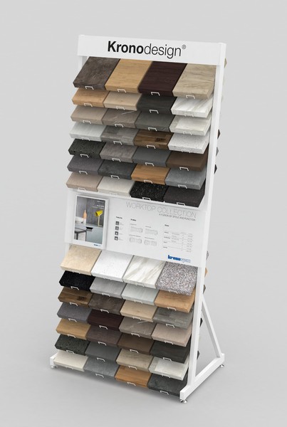 Vision designed and manufactured display stands for a new rage of kitchen worktops and flooring as launched by Kronospan. These displays needed to be compact yet efficient at holding the full range of products. We manufactured the whole displays along with full POS print, then produced the physical display samples from Kronospan material.