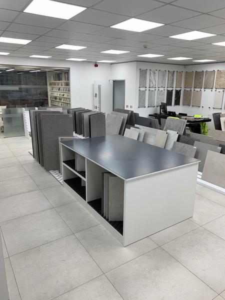 Vision designed and manufactured the displays for the Premier Stone showroom in Manchester. This included Cube displays, a layout table and a selection of tile display bases, all finished in white to complement this high-end showroom.
