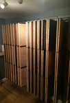The clapper doors are designed to hold wood flooring samples and are open on the front edge, allowing customers to easily remove the panels for viewing and selection.